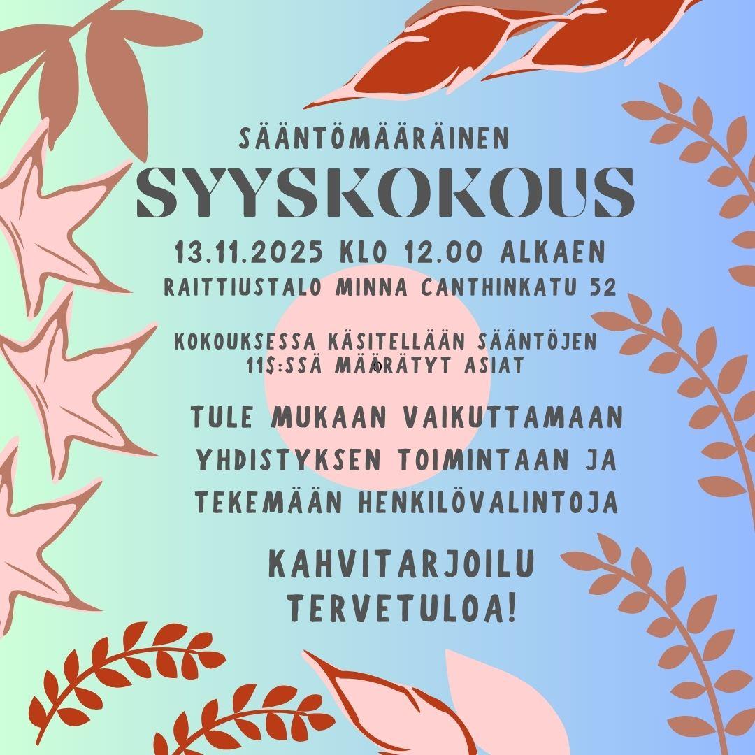 Hallituksen kokous pidettiin 2.9. 2025. Päätöstiivistelmän pääset lukemaan jäsensivuilta