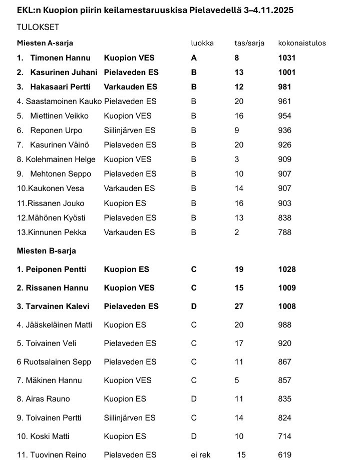 EKL:n Kuopion keilakilapailujen tulokset ja valokuvat nähtävillä täällä: https://kuopio-kves.elakkeensaajat.fi/toiminta/kilpailut/kilpailutulokset/keilakilpailut/