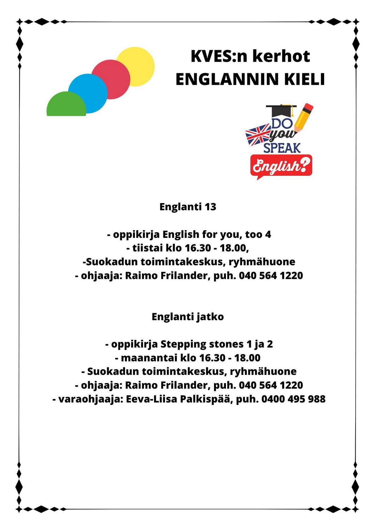 Englanti jatko: Maanantai klo 16.30 - 18.00, Ryhmähuone