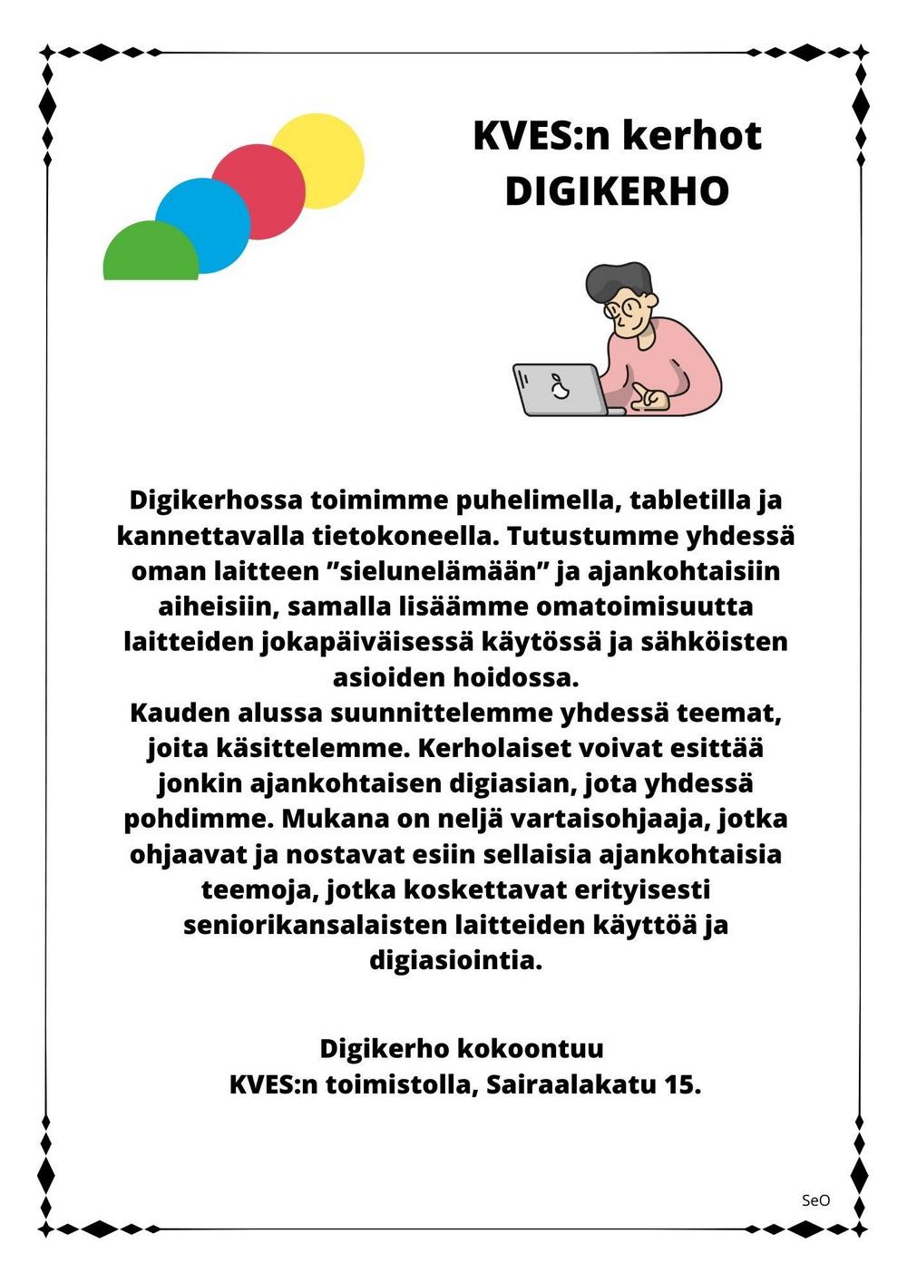 KVES toimisto, Sairaalakatu 15Maanantai klo 12.30 - 3.3026.1., 9.3, ja 27.4.2026Ohjaaja: Raija Eronen, puh. 050 529 4070Varaohjaaja: Raili Lahti, puh. 044 538 8054