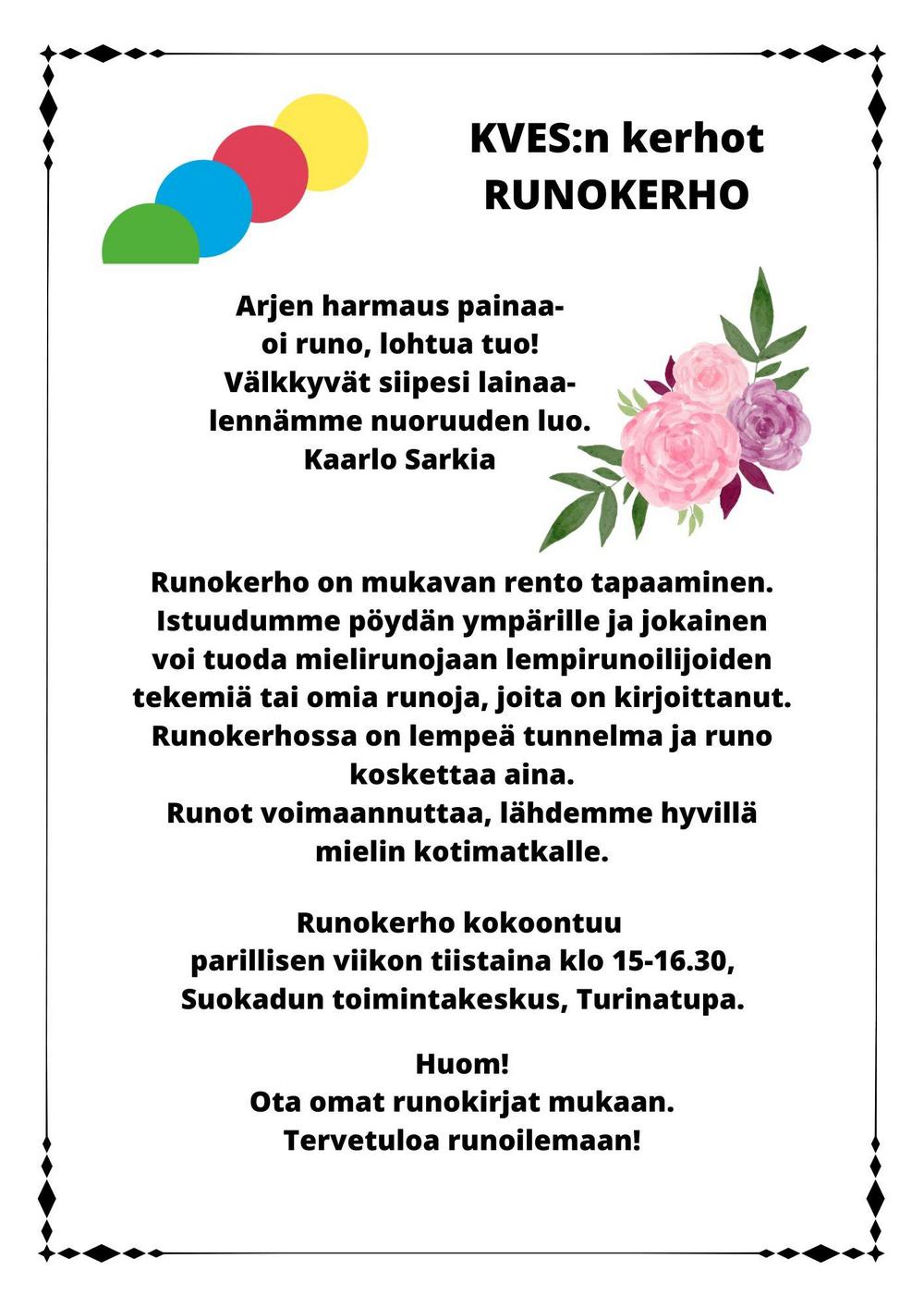 Suokadun toimintakeskus, Suokatu 6Parillisen viikon tiistai, 15.00 - 16.30, Turinatupa16.9. -9.12.2025Ohjaaja: Liisa Pulkkinen, puh. 050 358 0066Varaohjaaja: Leila Keinänen, puh. 044 327 8547